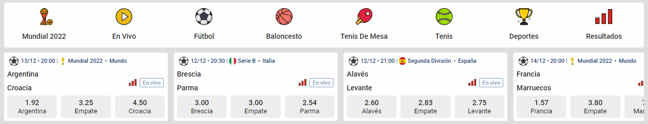 La oferta puede variar según los partidos disponibles y lo que hace que sea una forma de apuesta tan popular es que las cuotas se actualizan en tiempo real y para cada partido tiene estadísticas y resúmenes de los equipos. Sin embargo, todavía no cuenta con imágenes en streaming, lo que representa una desventaja.